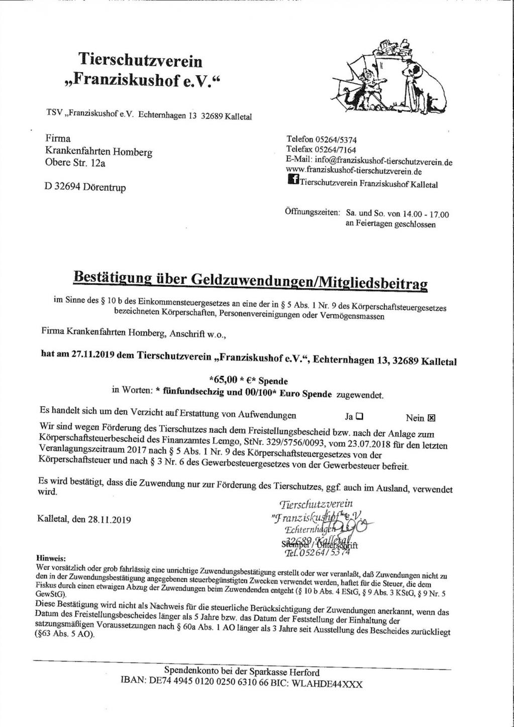 Wir haben den Spendenbetrag in Höhe von 65.00€ übergeben und den Tierschutzverein Franziskushof e.V. im Kalletal sehr glücklich gemacht.